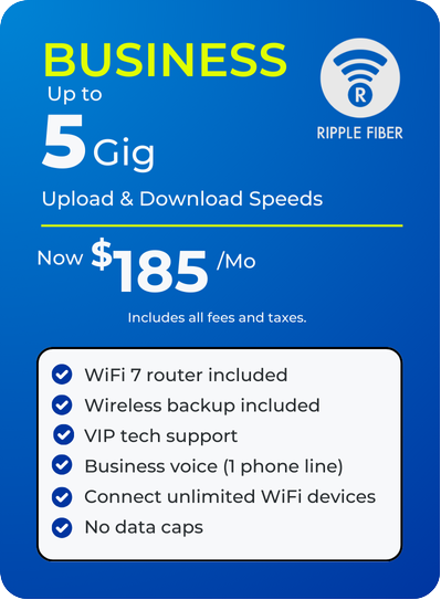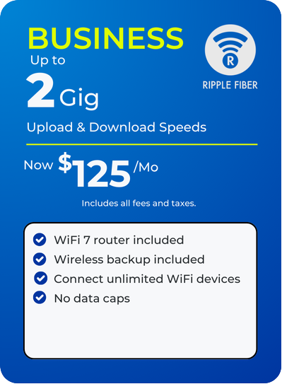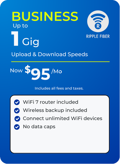 Our business fiber internet plans deliver fast, reliable speeds that keep your daily operations running smoothly - from taking customer calls and processing payments to using cloud tools and video meetings. With dependable connectivity, local support, and scalable options, Ripple Fiber helps your business stay connected today and ready for whatever comes next.